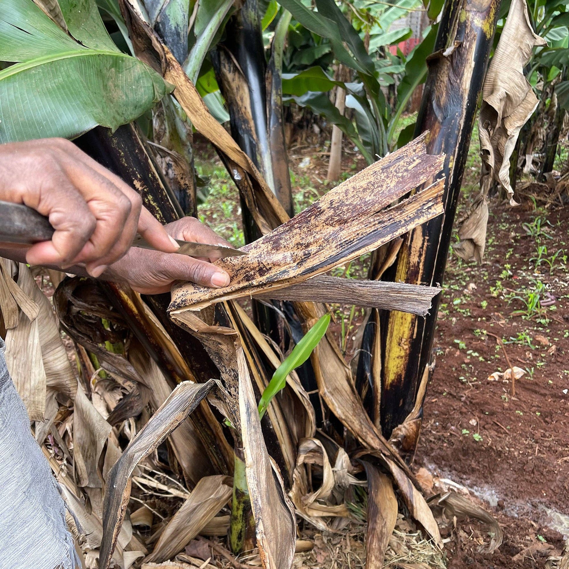 First, the banana fiber is dried, and then a light varnish is applied. The varnish on the banana fiber, with its many shades of brown, resembles textured tortoise shell. Once the process is complete, the artisans cut the fiber into strips to make one-of-a-kind goods.